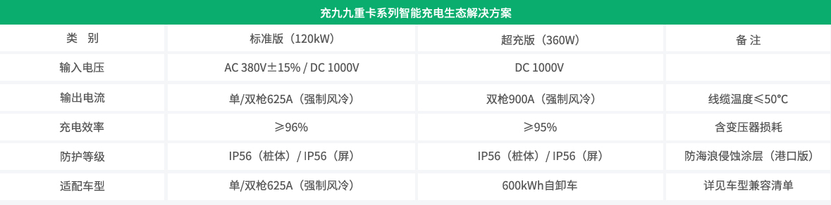 充九九重卡系列充電樁適用場景及標準參數表